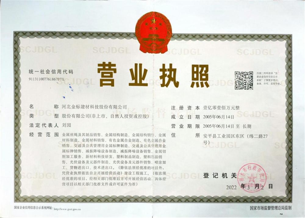 河北金標建材科技股份有限公司成立于2005年,1998年開始建廠生產,是一家國內較早從事交安材料的專業生產廠家之一;公司占地200萬畝,擁有員工400余名,注冊資金6040萬, 已通過ISO9001質量管理體系認證,具備產品批量生產合格證、多項檢測報告等,先后獲得“AAA級信用企業”、河北優秀企業”等殊榮。公司業務經營范圍包括高速公路、鐵路聲屏障生產基地;隔離柵,防護柵欄、刺鐵絲生產基地。